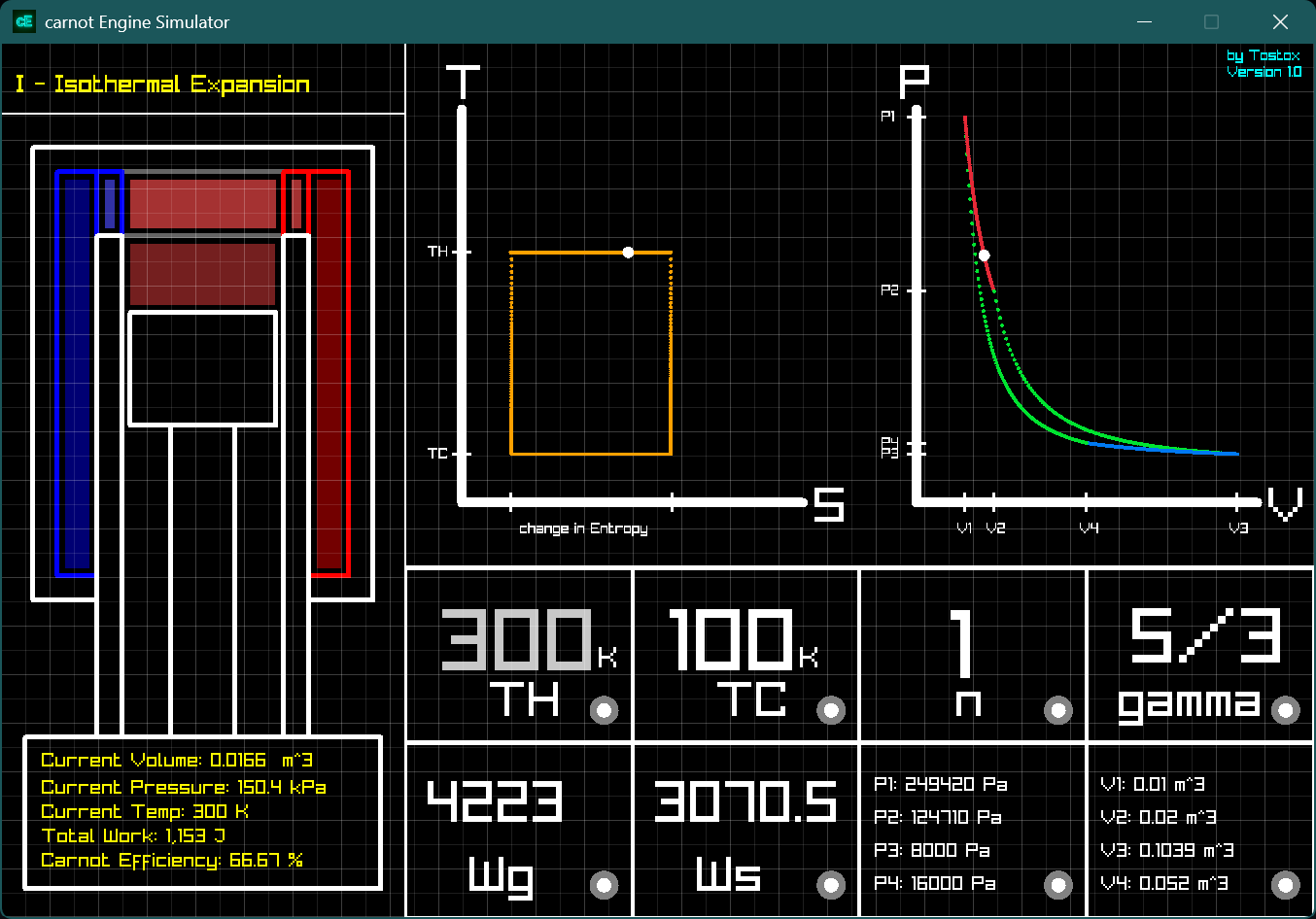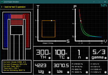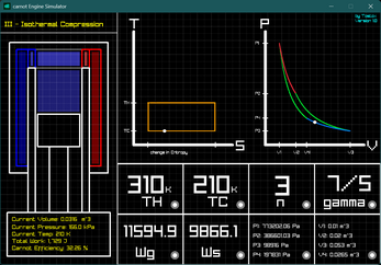 A real-time Carnot engine simulator that visualizes the full cycle with PV and TS diagrams, a moving piston animation, and calculated outputs like efficiency and work. Designed for students and physics enthusiasts who want an intuitive way to explore thermodynamics.